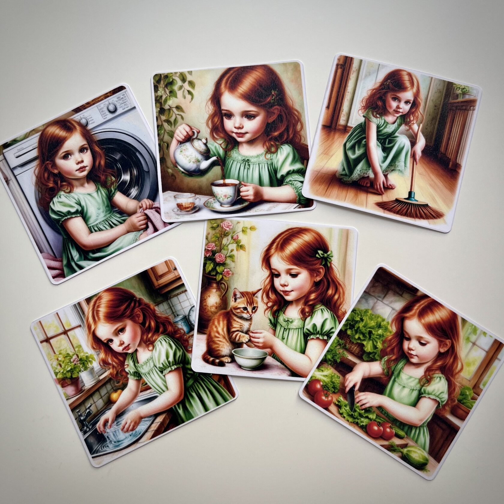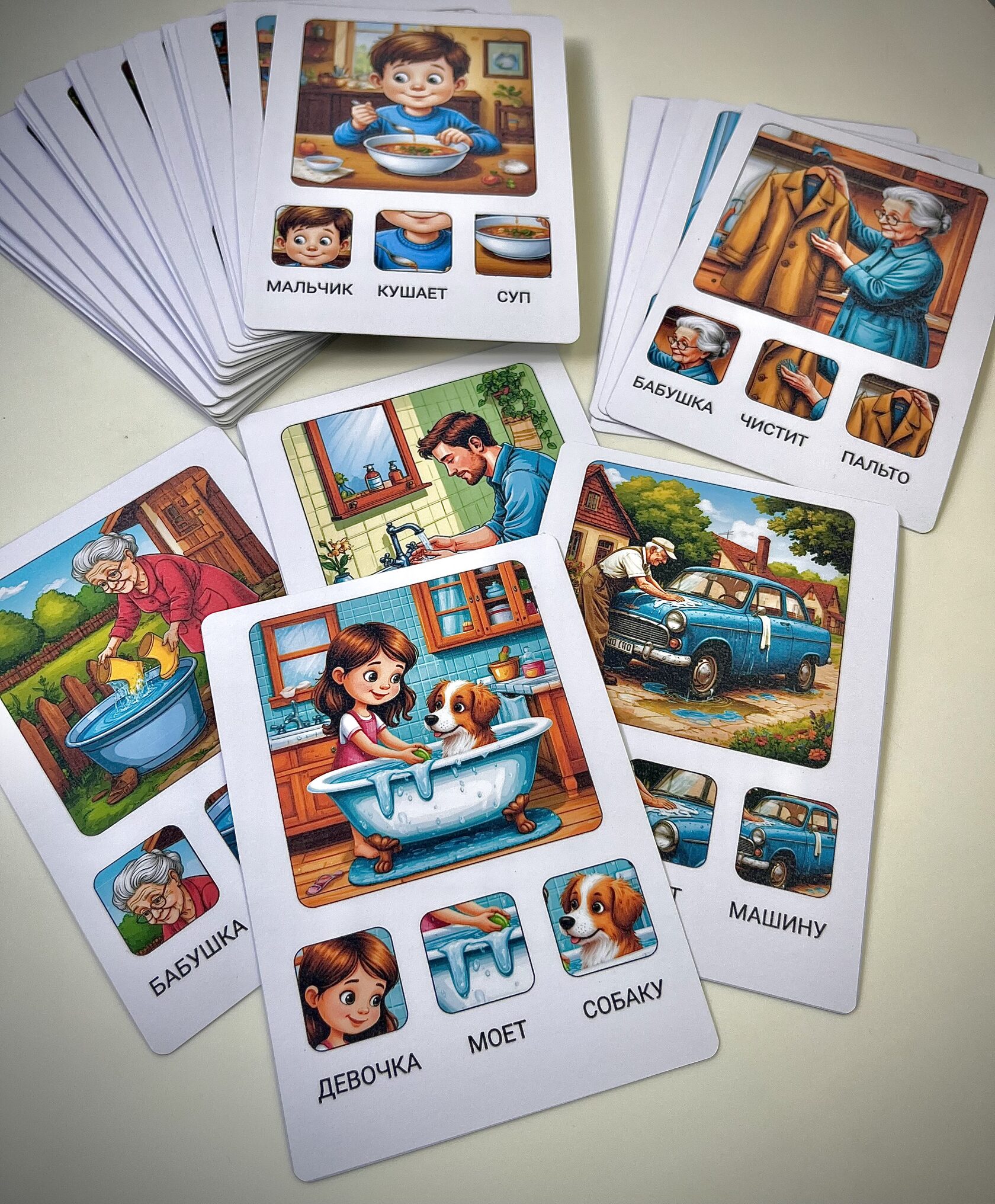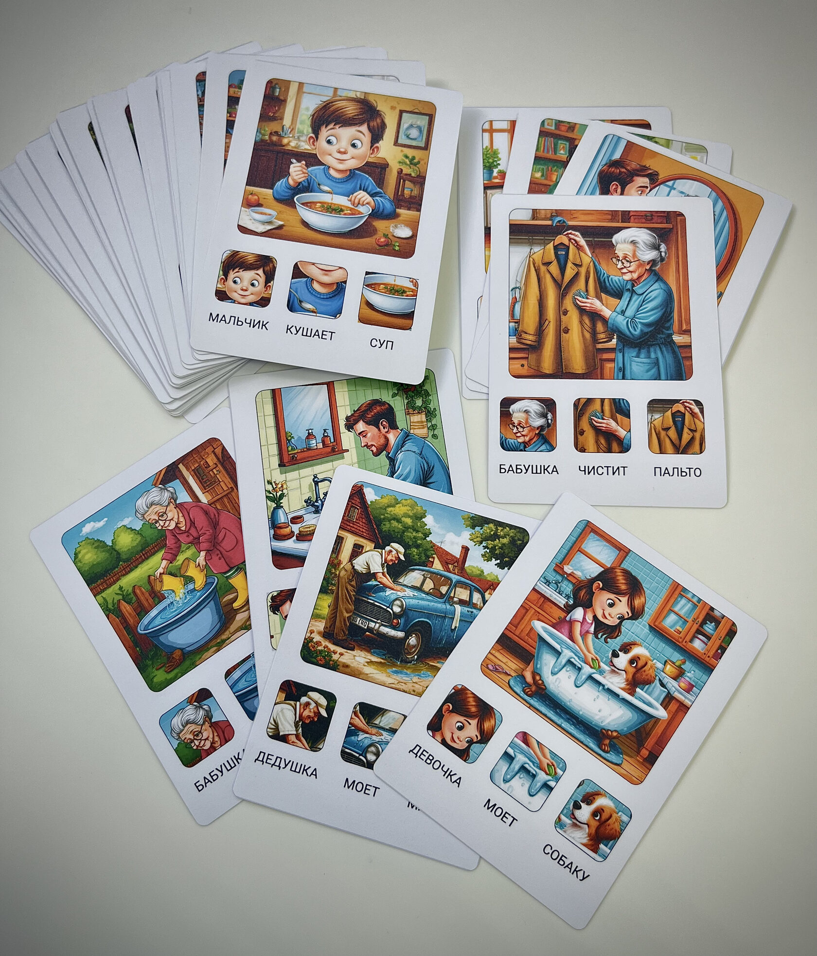 Пособие на глаголы действий очень актуально для работы с детьми с нарушением понимания речи. Наклейки с глаголами универсальный материал, можно наклеить на стаканчики, кубики или одежду ребенка и интегрировать игровой процесс в структуру занятия.
