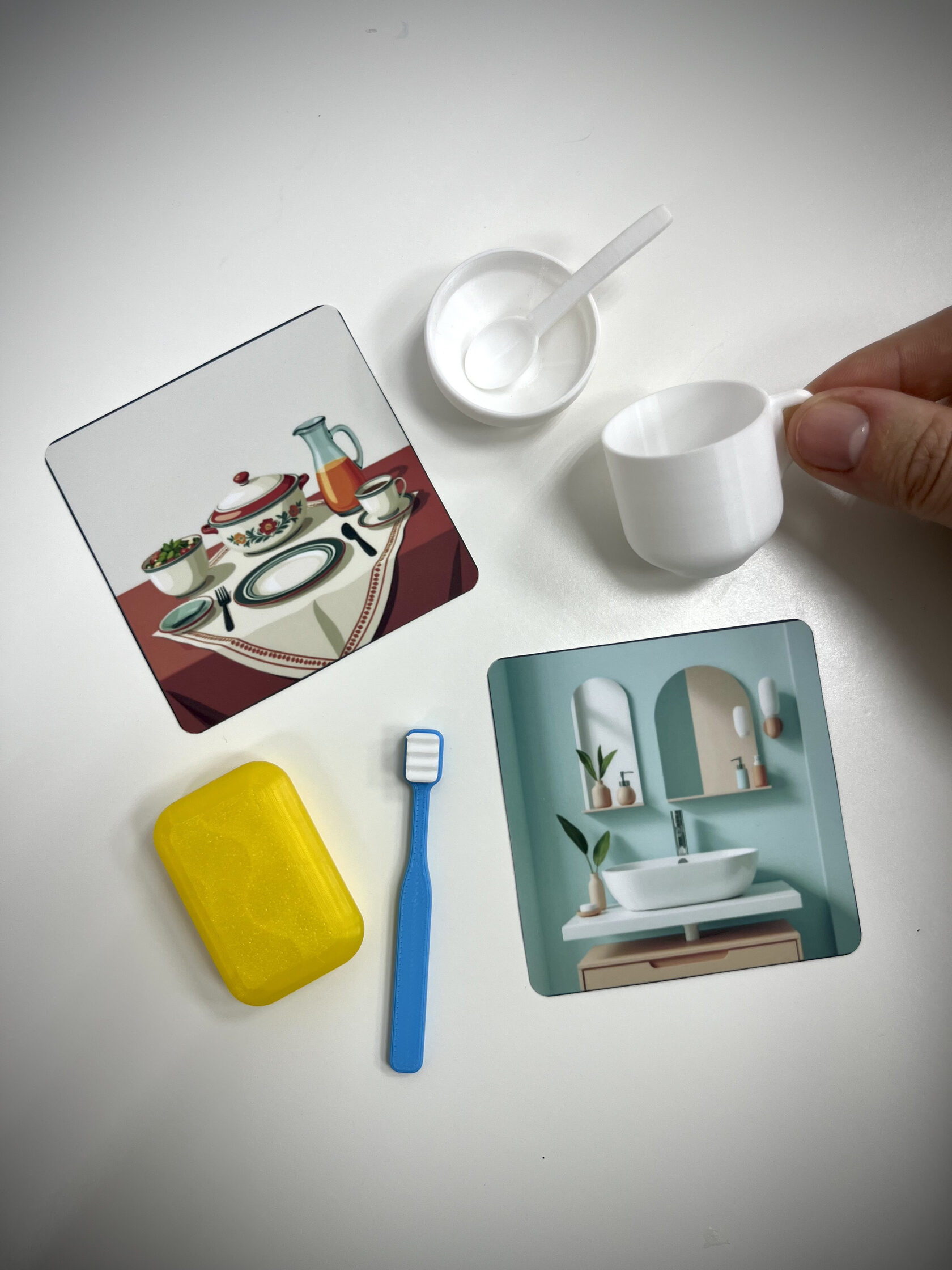 С помощью такого набора вы сможете провести не только диагностику, но и занятия. Фигурки можно использовать, включая соответствующий звук, а также можно использовать устную инструкцию номинативного или предикативного уровня: «покажи, где кружка», «дай то, что едет» или «чем будем чистить зубы?». Такое пособие подойдёт педагогам, работающим с детьми с нарушением понимания речи и неречевых звуков.