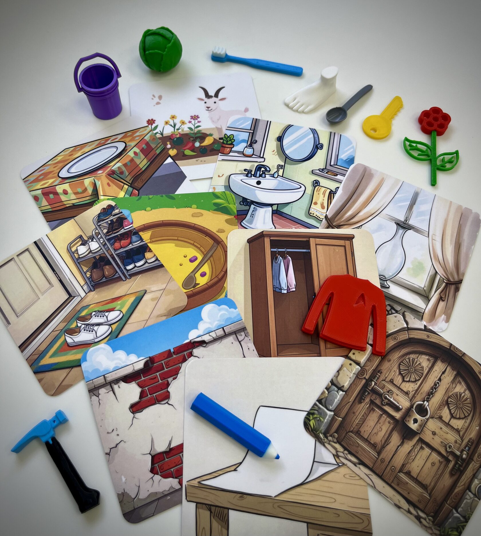 Основная цель этого пособия — формирование логических связей и мышления у детей. Конечно, такие фигурки и карточки можно использовать и для работы с другими задачами. Например, можно тренировать память, дайте ребёнку последовательность из двух действий: «порисуй карандашом, а потом открой дверь ключом». Используя картинки и фигурки, можно работать с ребёнком на понимание речи номинативного и предикативного уровня.